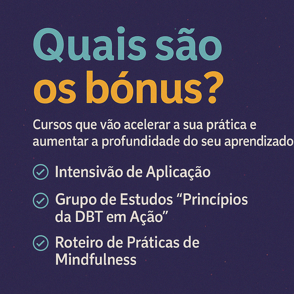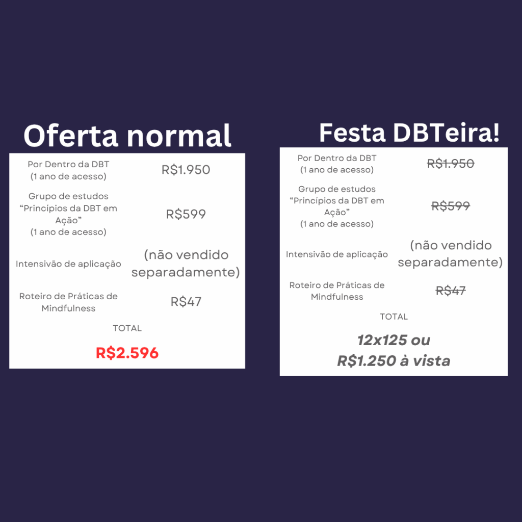 No início de ano eu fiz uma espécie de “retiro” em que as alunas se dedicaram durante um final de semana inteiro a aplicarem pontos essenciais da DBT de forma rápida e focada. Coisas que você vai ver nesse curso: